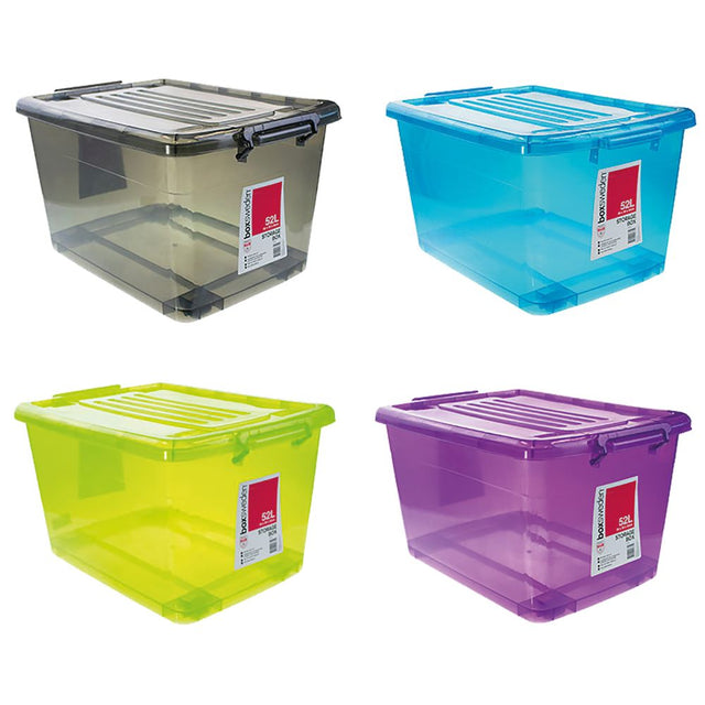 Tackle bigger storage jobs with the Boxsweden 52L transparent tub. Clip-lock sides secure the lid to protect contents and the built-in wheels make moving loads simpler. The clear coloured body helps identify what's inside without the need for opening the tub. Use it for seasonal decor, toys or bulk pantry items.